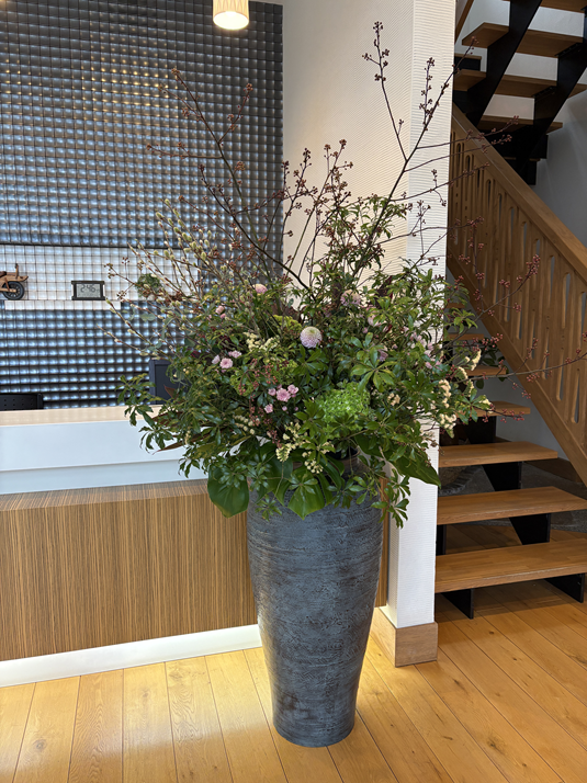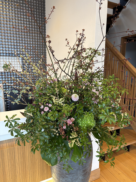 瑞々しいグリーンとやわらかなピンクのお花がほのかに春の訪れを感じさせてくれて、